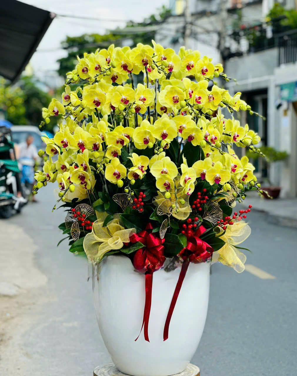 Mỗi chậu lan được các nhà thiết kế chuyên nghiệp lựa chọn kỹ lưỡng từ những cành hoa khỏe mạnh, nở đều, dáng thế đẹp, kết hợp cùng phụ kiện Tết như đồng tiền vàng, câu đối đỏ, dây pháo, nơ trang trí... Tất cả được trồng trong chậu sứ cao cấp, mang đậm không khí Tết, phù hợp để chưng trong phòng khách, sảnh lễ tân, bàn thờ, hoặc làm quà biếu Tết sang trọng.