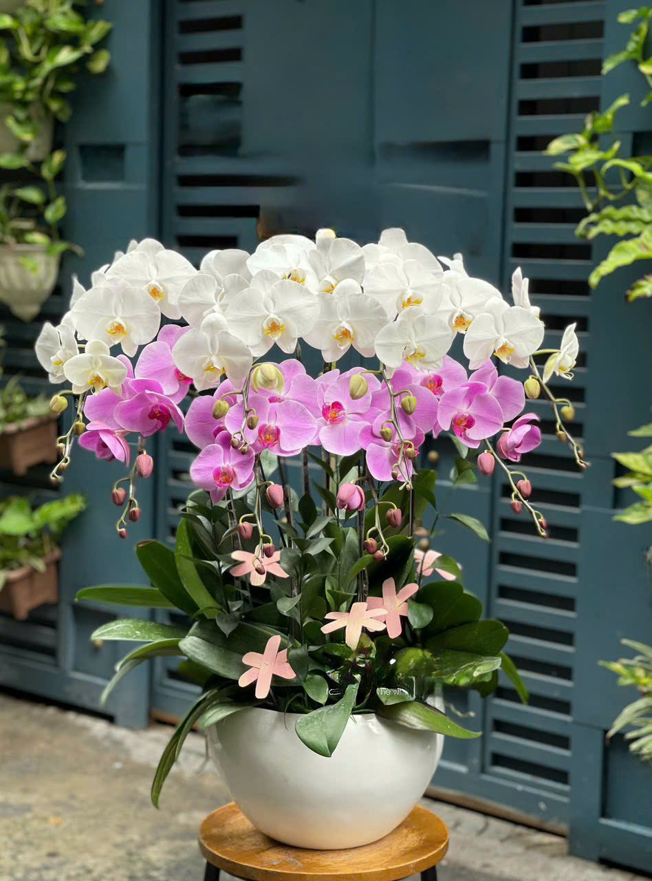 Mỗi chậu lan được các nhà thiết kế chuyên nghiệp lựa chọn kỹ lưỡng từ những cành hoa khỏe mạnh, nở đều, dáng thế đẹp, kết hợp cùng phụ kiện Tết như đồng tiền vàng, câu đối đỏ, dây pháo, nơ trang trí... Tất cả được trồng trong chậu sứ cao cấp, mang đậm không khí Tết, phù hợp để chưng trong phòng khách, sảnh lễ tân, bàn thờ, hoặc làm quà biếu Tết sang trọng.