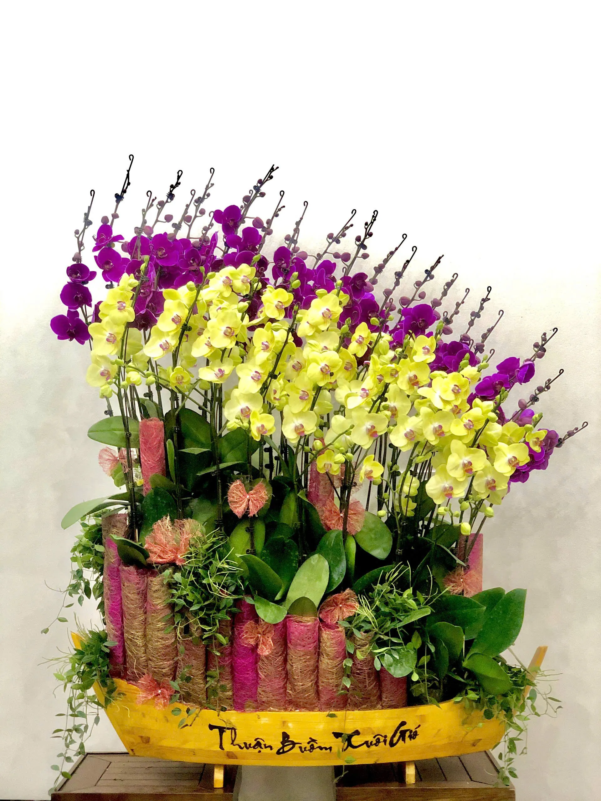 Mỗi chậu lan được các nhà thiết kế chuyên nghiệp lựa chọn kỹ lưỡng từ những cành hoa khỏe mạnh, nở đều, dáng thế đẹp, kết hợp cùng phụ kiện Tết như đồng tiền vàng, câu đối đỏ, dây pháo, nơ trang trí... Tất cả được trồng trong chậu sứ cao cấp, mang đậm không khí Tết, phù hợp để chưng trong phòng khách, sảnh lễ tân, bàn thờ, hoặc làm quà biếu Tết sang trọng.