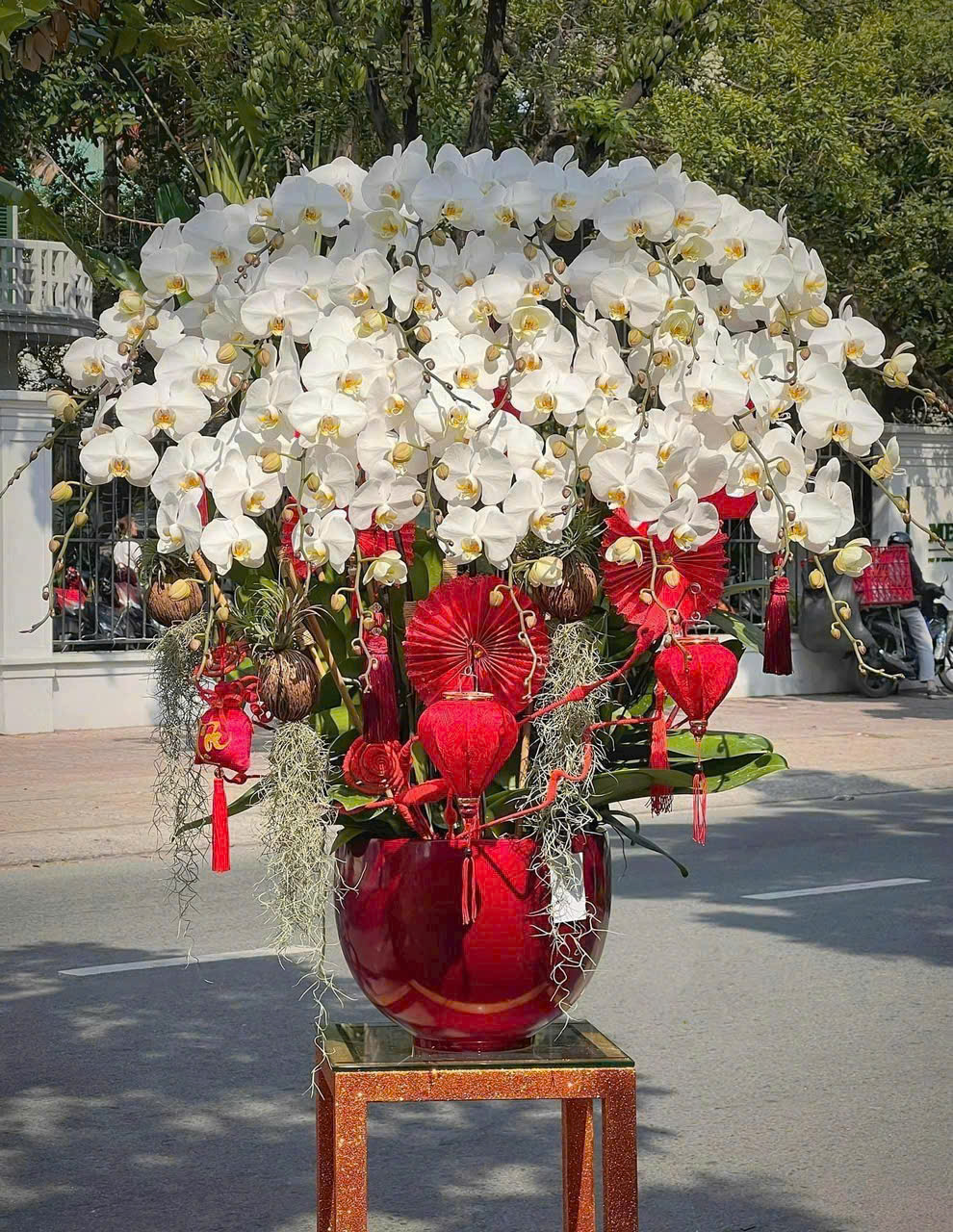 Mỗi chậu lan được các nhà thiết kế chuyên nghiệp lựa chọn kỹ lưỡng từ những cành hoa khỏe mạnh, nở đều, dáng thế đẹp, kết hợp cùng phụ kiện Tết như đồng tiền vàng, câu đối đỏ, dây pháo, nơ trang trí... Tất cả được trồng trong chậu sứ cao cấp, mang đậm không khí Tết, phù hợp để chưng trong phòng khách, sảnh lễ tân, bàn thờ, hoặc làm quà biếu Tết sang trọng.