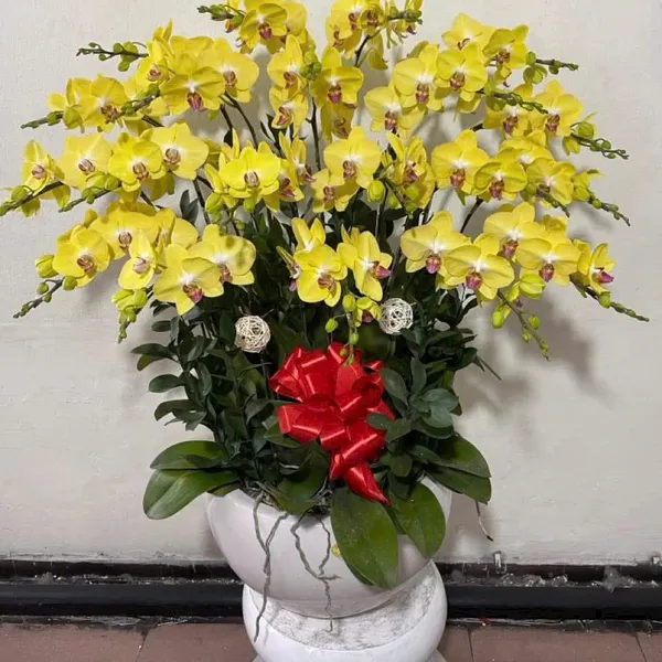 Mỗi chậu lan được các nhà thiết kế chuyên nghiệp lựa chọn kỹ lưỡng từ những cành hoa khỏe mạnh, nở đều, dáng thế đẹp, kết hợp cùng phụ kiện Tết như đồng tiền vàng, câu đối đỏ, dây pháo, nơ trang trí... Tất cả được trồng trong chậu sứ cao cấp, mang đậm không khí Tết, phù hợp để chưng trong phòng khách, sảnh lễ tân, bàn thờ, hoặc làm quà biếu Tết sang trọng.