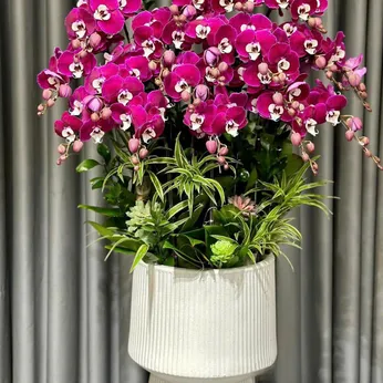 Mỗi chậu lan được các nhà thiết kế chuyên nghiệp lựa chọn kỹ lưỡng từ những cành hoa khỏe mạnh, nở đều, dáng thế đẹp, kết hợp cùng phụ kiện Tết như đồng tiền vàng, câu đối đỏ, dây pháo, nơ trang trí... Tất cả được trồng trong chậu sứ cao cấp, mang đậm không khí Tết, phù hợp để chưng trong phòng khách, sảnh lễ tân, bàn thờ, hoặc làm quà biếu Tết sang trọng.