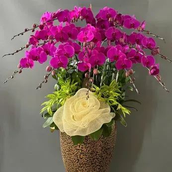 Mỗi chậu lan được các nhà thiết kế chuyên nghiệp lựa chọn kỹ lưỡng từ những cành hoa khỏe mạnh, nở đều, dáng thế đẹp, kết hợp cùng phụ kiện Tết như đồng tiền vàng, câu đối đỏ, dây pháo, nơ trang trí... Tất cả được trồng trong chậu sứ cao cấp, mang đậm không khí Tết, phù hợp để chưng trong phòng khách, sảnh lễ tân, bàn thờ, hoặc làm quà biếu Tết sang trọng.