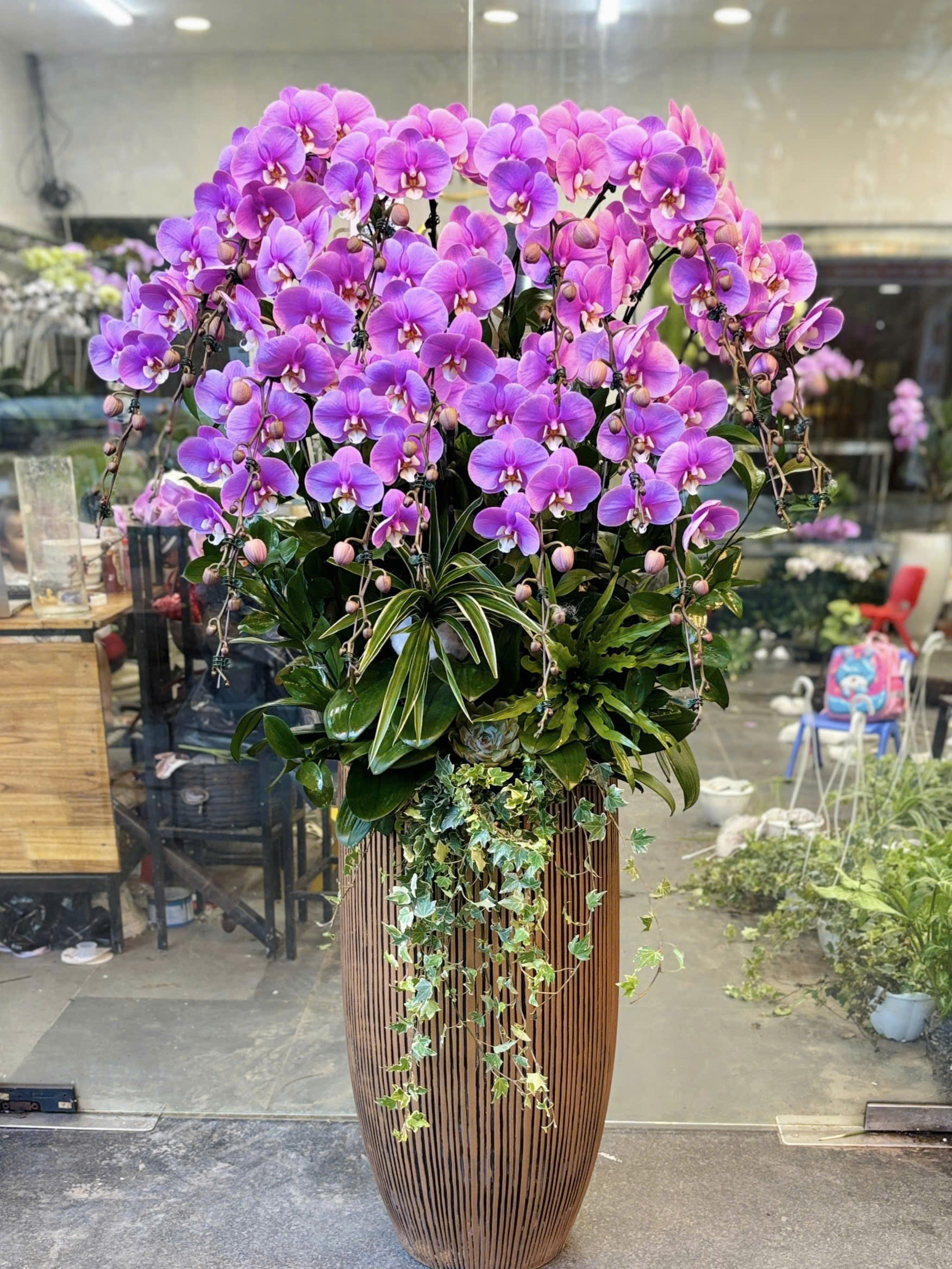 Mỗi chậu lan được các nhà thiết kế chuyên nghiệp lựa chọn kỹ lưỡng từ những cành hoa khỏe mạnh, nở đều, dáng thế đẹp, kết hợp cùng phụ kiện Tết như đồng tiền vàng, câu đối đỏ, dây pháo, nơ trang trí... Tất cả được trồng trong chậu sứ cao cấp, mang đậm không khí Tết, phù hợp để chưng trong phòng khách, sảnh lễ tân, bàn thờ, hoặc làm quà biếu Tết sang trọng.